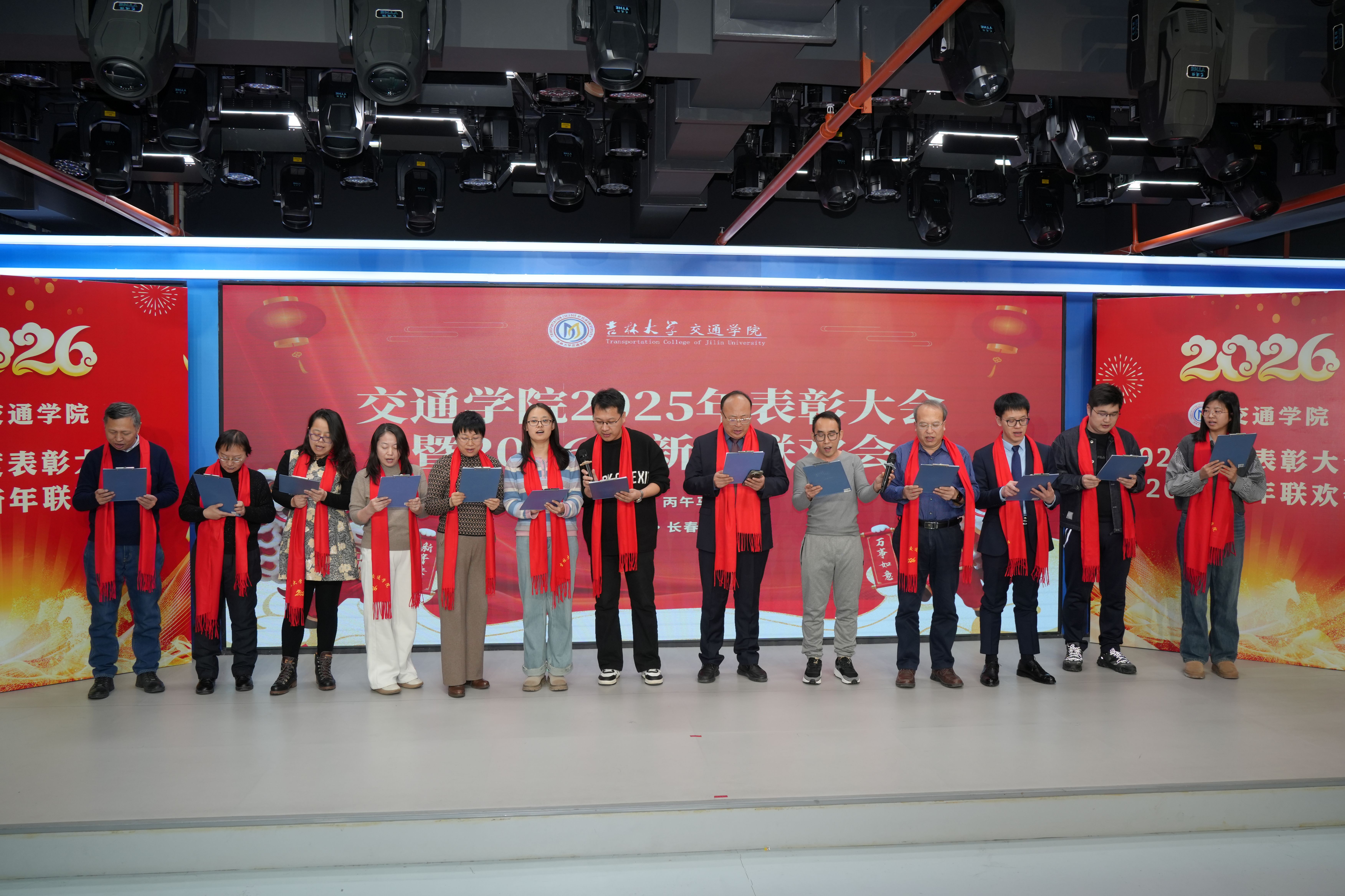 表彰大会结束后,学院2026新年联欢会拉开帷幕。联欢会现场布置得温馨喜庆,充满了节日氛围。各系和机关精心准备的歌曲、舞蹈、诗朗诵、脱口秀等节目依次登场。教职工们纷纷展示才艺,用歌声传递对新年的美好期许,用朗诵表达对学院的热爱之情。